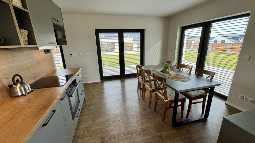 Prostorná kuchyň nabízí vše, co potřebujete – varnou desku, troubu, mikrovlnku, myčku i rychlovarnou konvici. U velkého jídelního stolu se pohodlně usadí celá rodina.