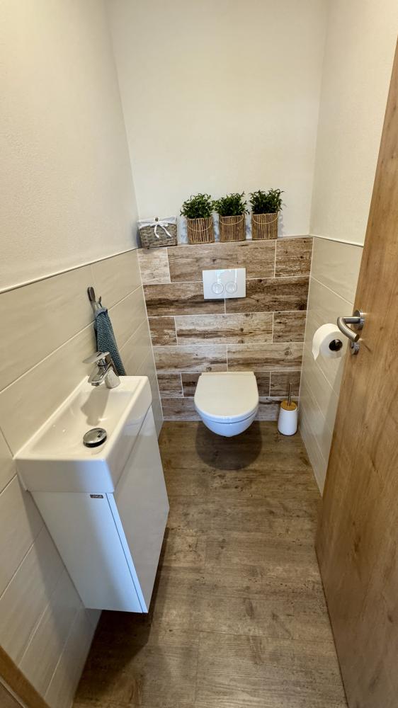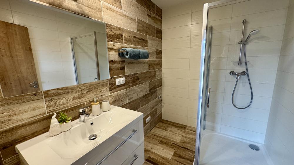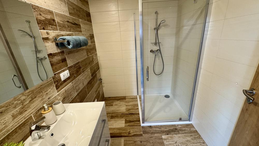 K dispozici je moderní koupelna se sprchovým koutem a samostatné WC. Pračka a sušička jsou umístěny v garáži, kterou apartmán sdílí s vedlejším apartmánem A3.